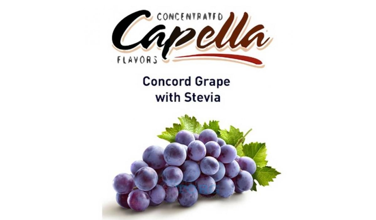 Вкус винограда сорта Конкорд довольно точно передает арома Concord Grape with Stevia американского производителя Capella Flavors. Это сочный, виноградный ароматизатор, который изготовлен с добавлением сахарозаменителя стевии (как обещают создатели, 0% калорий!). Замешивать Concord Grape with Stevia можно начиная с концентрации 3-5% в миксах заканчивая дозировкой 10% - в соло.