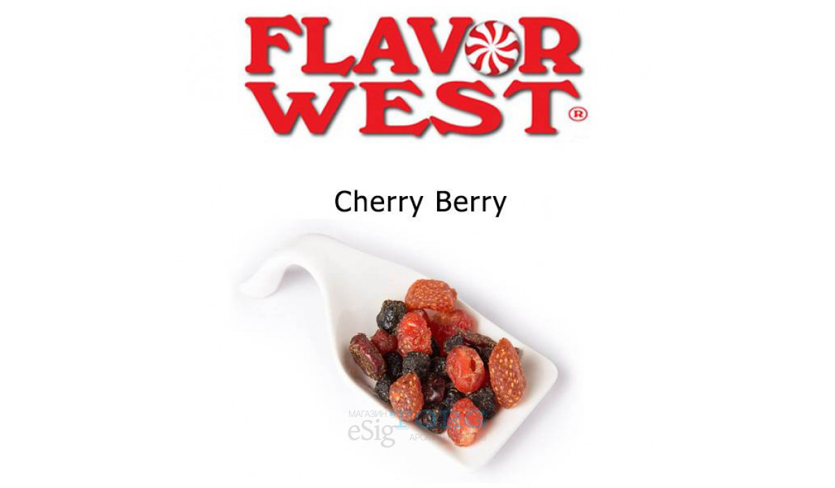 Cherry Berry — ягодный микс от Flavor West. Это яркая и сладкая смесь, которая включает в себя ароматы вишни, а также лесных ягод (земляники, ежевики). Можно смешиваяать арому в сольном виде или добавлять к ней сливки, молоко. Рекомендованные пропорции для смешиваяания Cherry Berry FW: 10% (соло) и от 0,1 до 5% (в сочетании с другими ароматизаторами).