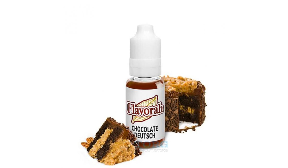 Chocolate Deutsch — вкус немецкого шоколадного торта. Этот десерт выпекается с добавлением какао, темного шоколада, сахара, сливок, кокосовой стружки и орехов. Вы можете смешиваяать Chocolate Deutsch FLV как самостоятельный вкус, а также в сочетании с табачными аромами, ликерами и кофе. Оптимальные концентрации: 0,5-1,6% (соло) и от 0,1 до 1,5% (в миксах).