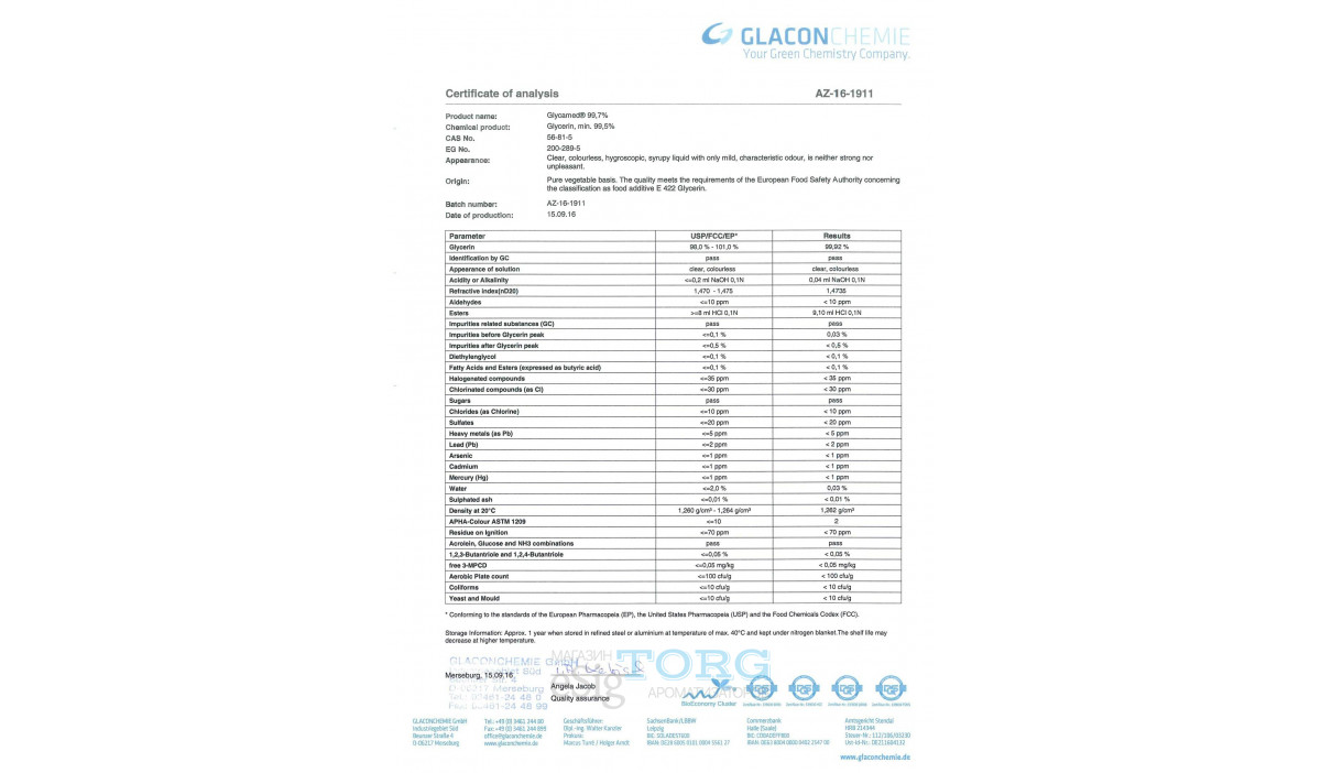 Глицерин VG USP GlaconchemeGMBH Описание